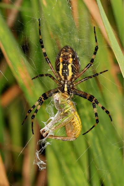 Wespenspinne [Argiope bruennichi] mit Beute (Grashüpfer)