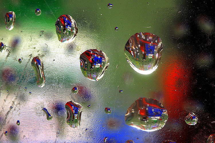 in den Wassertropfen an der Innenseite eines Glasbehälters spiegelt sich die Umgebung