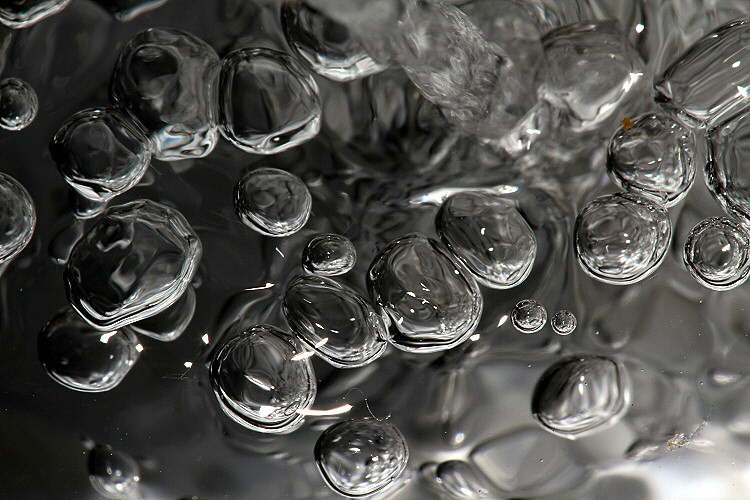 Luftblasen erzeugt durch Eingießen von Wasser in ein Glas
