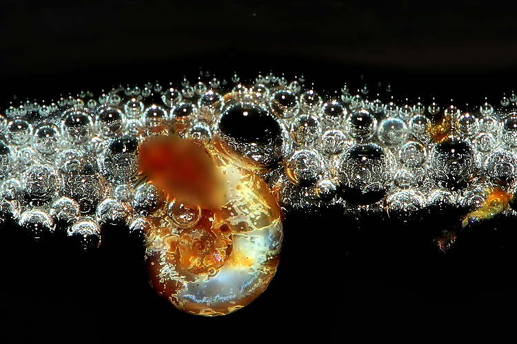 Posthornschnecke [Planorbarius corneus] zwischen kleinsten Luftbläschen im Aquarium