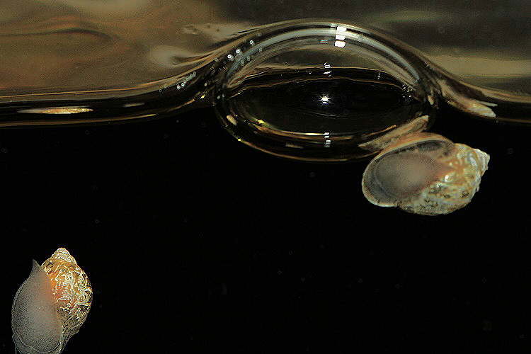 neben einer großen Luftblase im Aquarium zwei kleine Blasenschnecken ca. 12mm