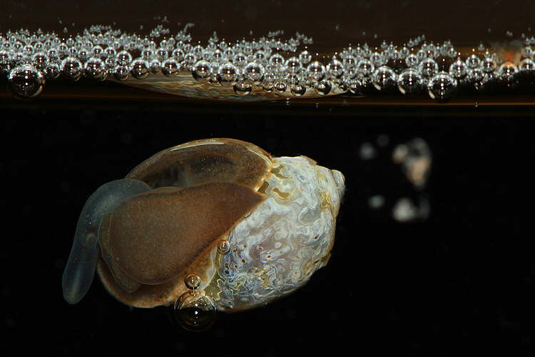 Blasenschnecke ca. 10mm an der Seitenscheibe im Aquarium
