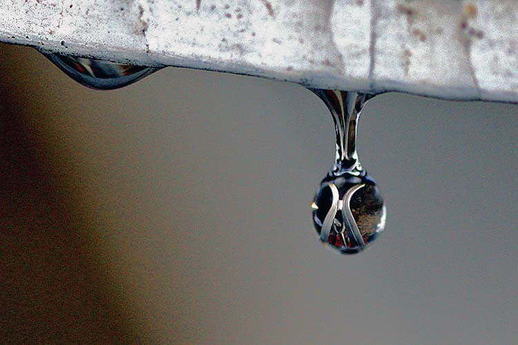ein Wassertropfen wird immer schwerer und fällt gleich vom Gartentisch [im Tropfen spiegeln sich die Beine des Tisches]
