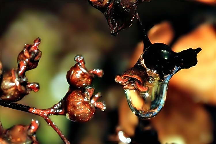 Regentropfen an einer vertrockneten Knospe einer Kletterhortensie