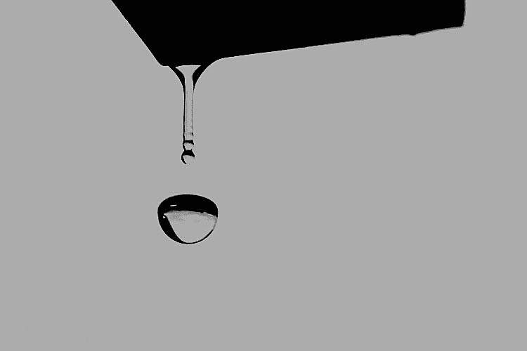 ein Wassertropfen hat sich von der Dachkante gelöst und fällt zu Boden